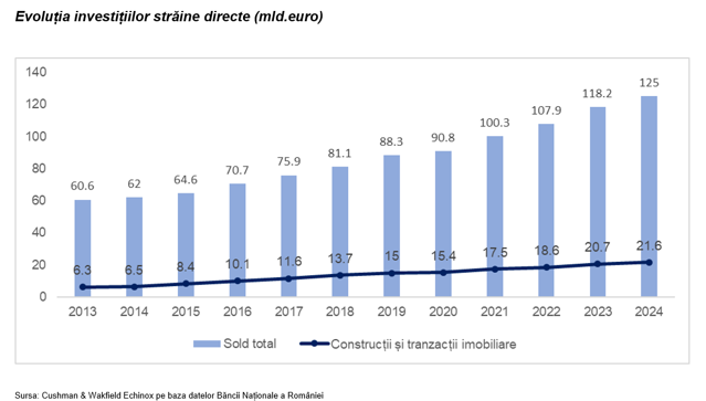 Fluxul de capital străin a contribuit la creşterea stocului de spaţii imobiliare moderne (birouri, retail şi industrial & logistic) de la aproximativ 5 milioane de metri pătraţi în 2014, la circa 17 milioane de metri pătraţi la finalul lui 2024, aproximativ 70% fiind deţinut de investitori din afara României.